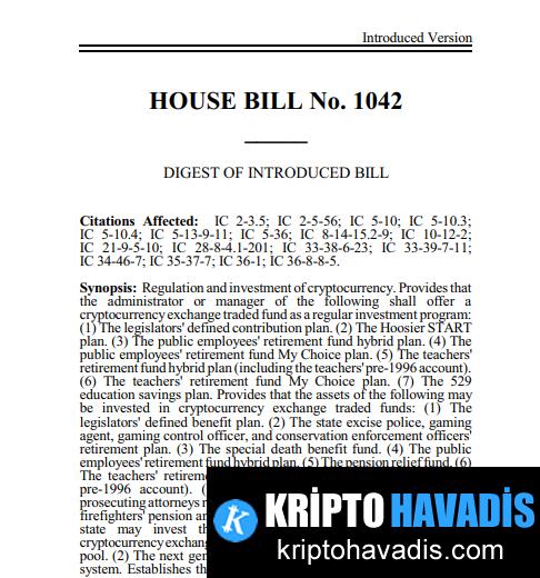 Yasalaşması durumunda, İndiana, kamu yönetimi altında olan emeklilik programlarının Bitcoin maruziyetini standart seçenek olarak sunmasını zorunlu kılan ilk eyalet olacak.